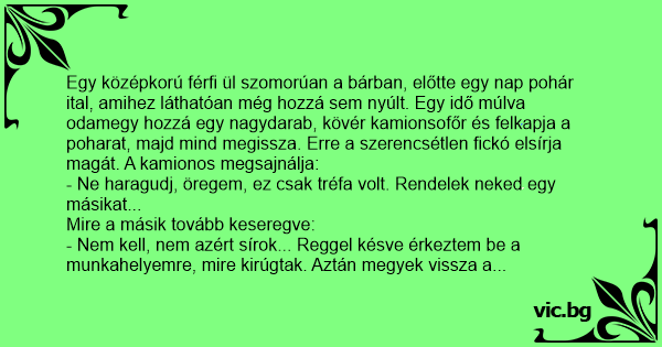 Egy középkorú férfi ül szomorúan a bárban, előtte egy nap pohár ital, amihez láthatóan még hozzá sem nyúlt. Egy idő múlva odamegy hozzá egy nagydarab, kövér kamionsofőr és felkapja a poharat, majd mind megissza. Erre a szerencsétlen fickó elsírja magát. A kamionos megsajnálja: