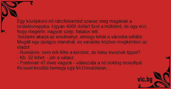 - Pontosan 47 éves vagyok - válaszolja a nő boldog mosollyal.