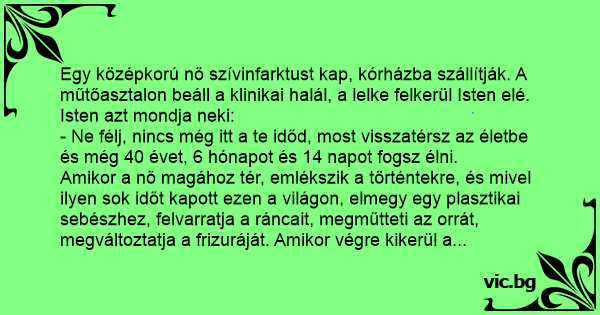 Amikor a nő magához tér, emlékszik a történtekre, és mivel ilyen sok időt kapott ezen a világon, elmegy egy plasztikai sebészhez, felvarratja a ráncait, megműtteti az orrát, megváltoztatja a frizuráját. Amikor végre kikerül a kórházból, elüti egy autó és azonnal meghal. Mikor felkerül Istenhez, szemrehányólag mondja neki:
