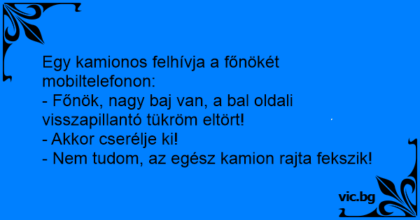 Egy kamionos felhívja a főnökét mobiltelefonon:<br />- Főnök, nagy baj van, a bal oldali visszapillantó tükröm eltört!<br />- Akkor cserélje ki!<br />- Nem tudom, az egész kamion rajta fekszik!