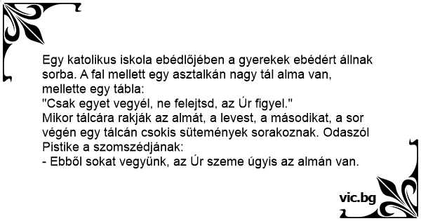- Ebből sokat vegyünk, az Úr szeme úgyis az almán van.
