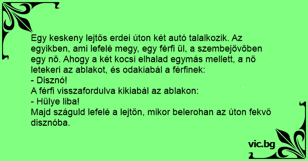 Egy keskeny lejtős erdei úton két autó talalkozik. Az egyikben, ami lefelé megy, egy férfi ül, a szembejövőben egy nő. Ahogy a két kocsi elhalad egymás mellett, a nő letekeri az ablakot, és odakiabál a férfinek: