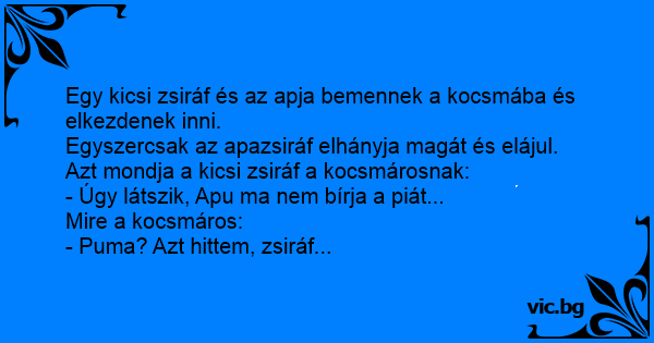 Egy kicsi zsiráf és az apja bemennek a kocsmába és elkezdenek inni.
