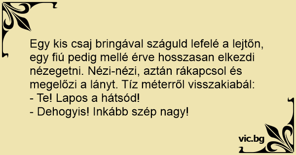 Egy kis csaj bringával száguld lefelé a lejtőn, egy fiú pedig mellé érve hosszasan elkezdi nézegetni. Nézi-nézi, aztán rákapcsol és megelőzi a lányt. Tíz méterről visszakiabál: