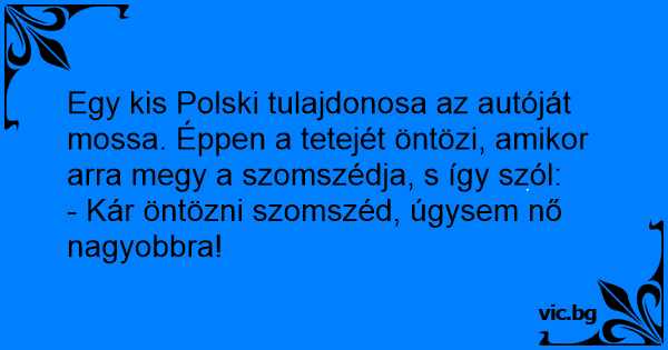 Egy kis Polski tulajdonosa az autóját mossa. Éppen a tetejét öntözi, amikor arra megy a szomszédja, s így szól: