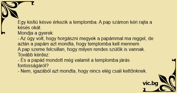 Egy kisfiú késve érkezik a templomba. A pap számon kéri rajta a késés okát.