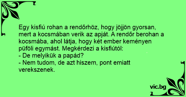 Egy kisfiú rohan a rendőrhöz, hogy jöjjön gyorsan, mert a kocsmában verik az apját. A rendőr berohan a kocsmába, ahol látja, hogy két ember keményen püföli egymást. Megkérdezi a kisfiútól: