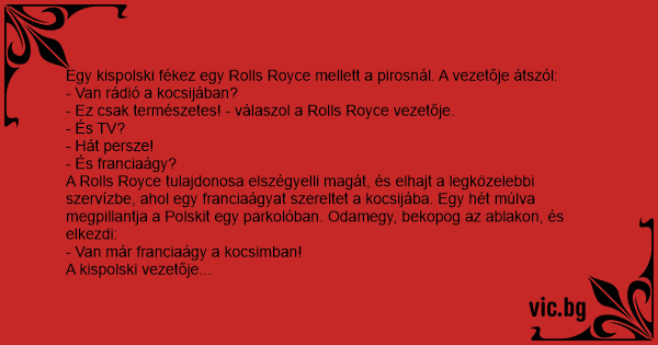 Egy kispolski fékez egy Rolls Royce mellett a pirosnál. A vezetője átszól: