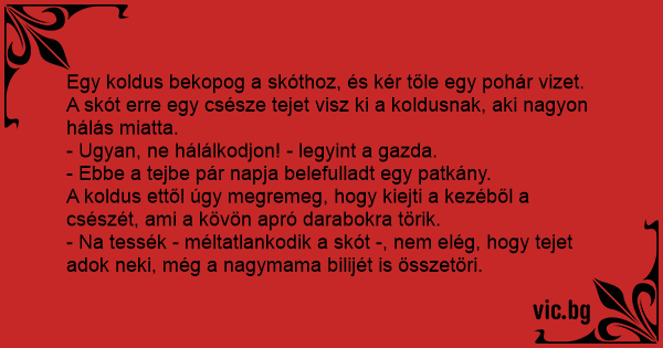 Egy koldus bekopog a skóthoz, és kér tőle egy pohár vizet. A skót erre egy csésze tejet visz ki a koldusnak, aki nagyon hálás miatta.