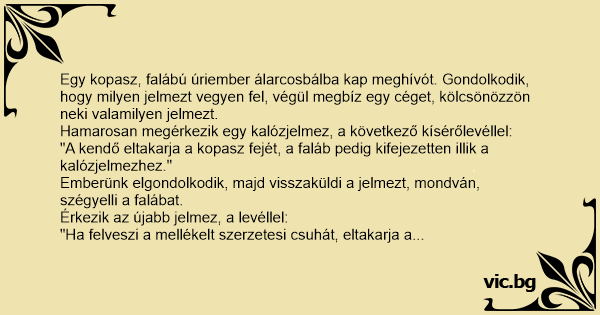 Emberünk elgondolkodik, majd visszaküldi a jelmezt, mondván, szégyelli a falábat.