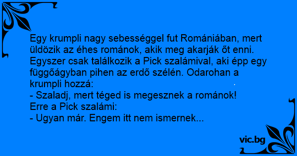 Egy krumpli nagy sebességgel fut Romániában, mert üldözik az éhes románok, akik meg akarják őt enni. Egyszer csak találkozik a Pick szalámival, aki épp egy függőágyban pihen az erdő szélén. Odarohan a krumpli hozzá: