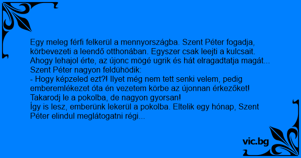 Egy meleg férfi felkerül a mennyországba. Szent Péter fogadja, körbevezeti a leendő otthonában. Egyszer csak leejti a kulcsait. Ahogy lehajol érte, az újonc mögé ugrik és hát elragadtatja magát...