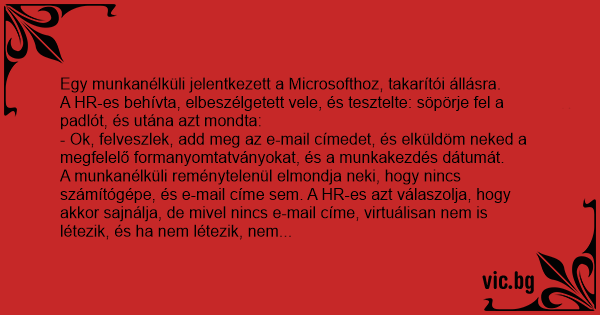 En arbejdsløs fyr søgte et rengøringsjob hos Microsoft. Chefen inviterer ham til samtale og en egnethedstest (som gulvvasker). Efter samtalen siger chefen til den arbejdsløse: "Du er ansat; giv mig...