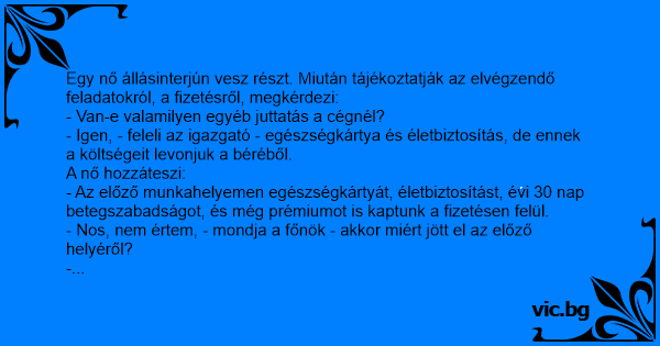 Egy nő állásinterjún vesz részt. Miután tájékoztatják az elvégzendő feladatokról, a fizetésről, megkérdezi: