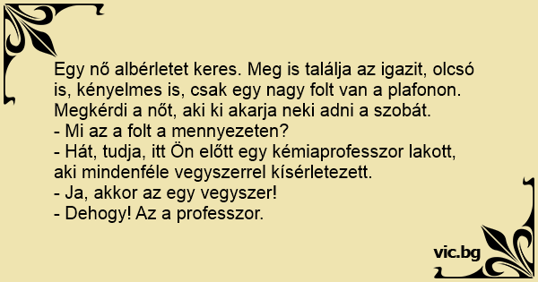 A takarítónő kérdi az iskolaigazgatót: - Mi az a csúnya folt a kémiaterem mennyezetén? - Ma a tanárnő egy igen veszélyes vegyülettel kísérletezett. - És miféle vegyület az ott a plafonon? - Az nem...
