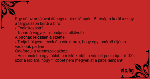 - Hozzanak be egy táblát, pár kiló krétát, a vádlott pedig írja fel 100-szor a táblára, hogy "Többet nem megyek át a piros lámpán!"