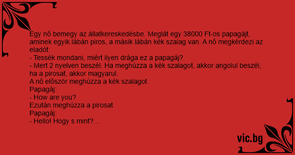 Egy nő elmegy a kisállat-kereskedésbe, hogy válasszon magának valamilyen hobbiállatot. Egy gyönyörű, színes tollú papagáj kelti fel az érdeklődését. Látja, hogy a madár lábairól két zsinór lóg, egy...