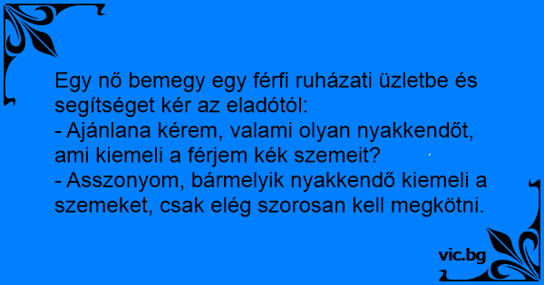 - Ajánlana kérem, valami olyan nyakkendőt, ami kiemeli a férjem kék szemeit?