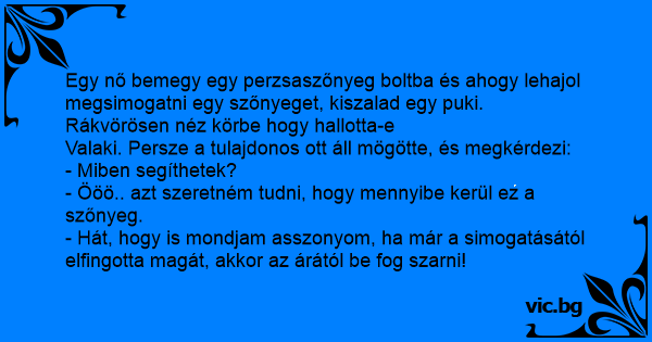 Egy nő bemegy egy perzsaszőnyeg boltba és ahogy lehajol megsimogatni egy szőnyeget, kiszalad egy puki. Rákvörösen néz körbe hogy hallotta-e