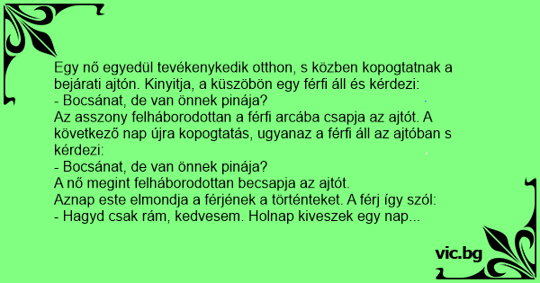 Az asszony felháborodottan a férfi arcába csapja az ajtót. A következő nap újra kopogtatás, ugyanaz a férfi áll az ajtóban s kérdezi: