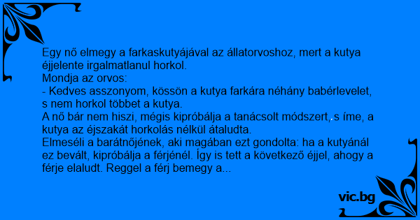 - Kedves asszonyom, kössön a kutya farkára néhány babérlevelet, s nem horkol többet a kutya.