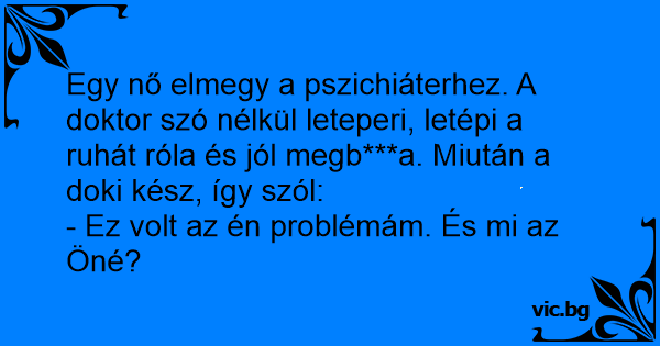 Egy nő elmegy a pszichiáterhez. A doktor szó nélkül leteperi, letépi a ruhát róla és jól megb***a. Miután a doki kész, így szól: