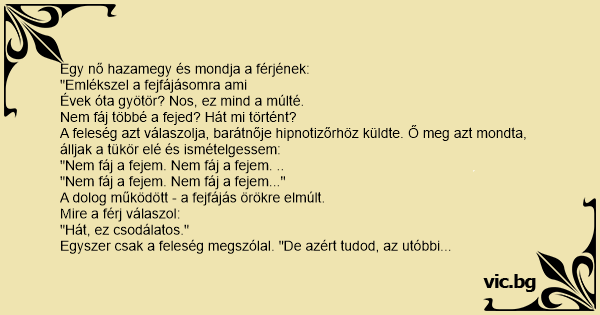 A feleség azt válaszolja, barátnője hipnotizőrhöz küldte. Ő meg azt mondta, álljak a tükör elé és ismételgessem: