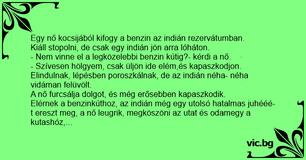Egy szőke nőnek kifogy a benzin a kocsijából és elkezd stoppolni, de csak egy indián veszi fel, és azt mondja: - Csak üljön fel hölgyem és kapaszkodjon erősen! Mennek, de az indián minden percben...