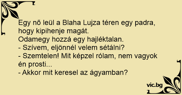 Egy szép hölgy üldögél a parkban az egyik padon. Odamegy hozzá egy visszataszító kinézetű hajléktalan. - Bocsásson meg, asszonyom, lenne kedve velem aludni? A nő meglepetten: - Piszok fráter,...