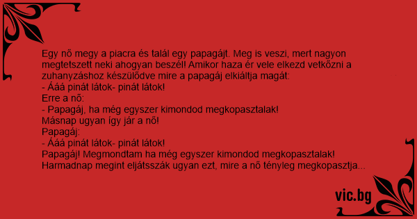 Egy nő megy a piacra és talál egy papagájt. Meg is veszi, mert nagyon megtetszett neki ahogyan beszél! Amikor haza ér vele elkezd vetkőzni a zuhanyzáshoz készülődve mire a papagáj elkiáltja magát: