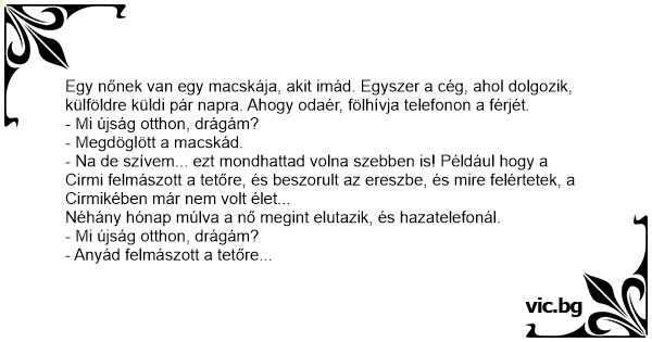 - Na de szívem... ezt mondhattad volna szebben is! Például hogy a Cirmi felmászott a tetőre, és beszorult az ereszbe, és mire felértetek, a Cirmikében már nem volt élet...