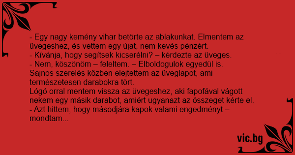 - Egy nagy kemény vihar betörte az ablakunkat. Elmentem az üvegeshez, és vettem egy újat, nem kevés pénzért.