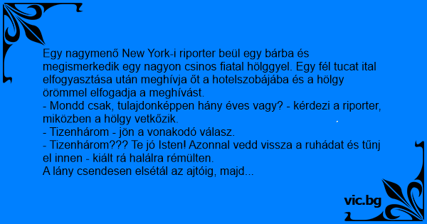 - Tizenhárom??? Te jó Isten! Azonnal vedd vissza a ruhádat és tűnj el innen - kiált rá halálra rémülten.