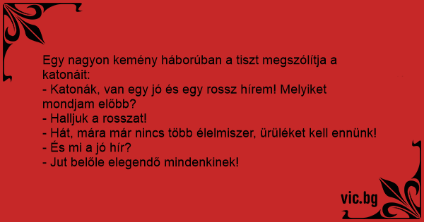 - Katonák, van egy jó és egy rossz hírem! Melyiket mondjam előbb?