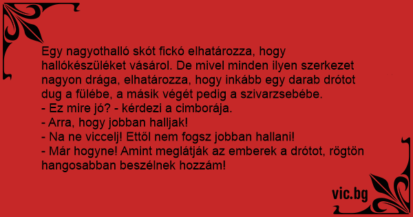 Egy nagyothalló skót fickó elhatározza, hogy hallókészüléket vásárol. De mivel minden ilyen szerkezet nagyon drága, elhatározza, hogy inkább egy darab drótot dug a fülébe, a másik végét pedig a szivarzsebébe.