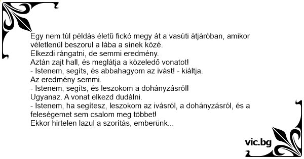 - Istenem, ha segítesz, leszokom az ivásról, a dohányzásról, és a feleségemet sem csalom meg többet!