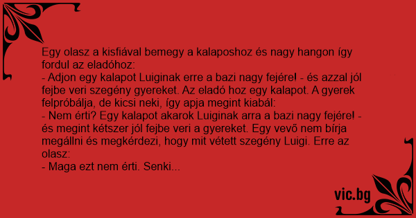 - Nem érti? Egy kalapot akarok Luiginak arra a bazi nagy fejére! - és megint kétszer jól fejbe veri a gyereket. Egy vevő nem bírja megállni és megkérdezi, hogy mit vétett szegény Luigi. Erre az olasz: