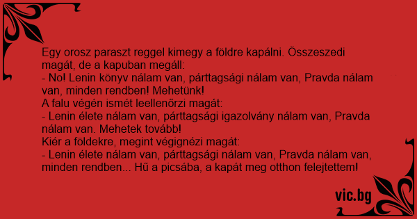 - Lenin élete nálam van, párttagsági nálam van, Pravda nálam van, minden rendben... Hű a picsába, a kapát meg otthon felejtettem!