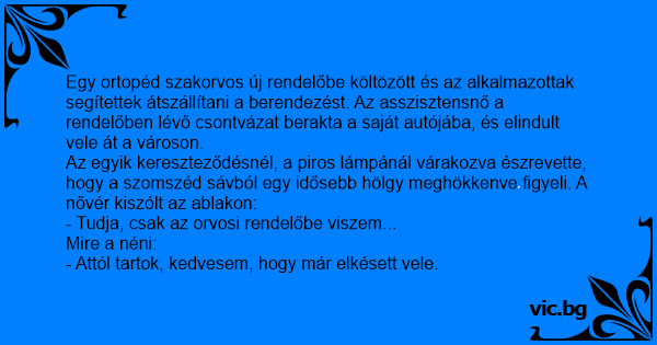 Egy ortopéd szakorvos új rendelőbe költözött és az alkalmazottak segítettek átszállítani a berendezést. Az asszisztensnő a rendelőben lévő csontvázat berakta a saját autójába, és elindult vele át a városon.