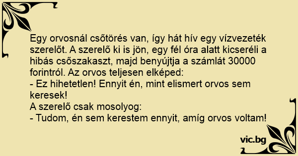 Egy orvosnál csőtörés van, így hát hív egy vízvezeték szerelőt. A szerelő ki is jön, egy fél óra alatt kicseréli a hibás csőszakaszt, majd benyújtja a számlát 30000 forintról. Az orvos teljesen elképed: