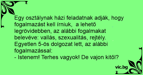 Egy osztálynak házi feladatnak adják, hogy fogalmazást kell írniuk, a lehető legrövidebben, az alábbi fogalmakat belevéve: vallás, szexualitás, rejtély.