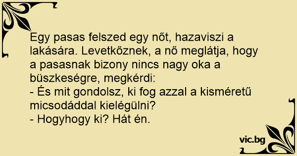 Egy pasas felszed egy nőt, hazaviszi a lakására. Levetkőznek, a nő meglátja, hogy a pasasnak bizony nincs nagy oka a büszkeségre, megkérdi: