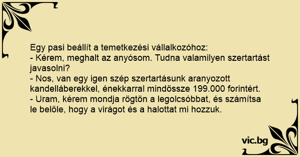 - Uram, kérem mondja rögtön a legolcsóbbat, és számítsa le belőle, hogy a virágot és a halottat mi hozzuk.