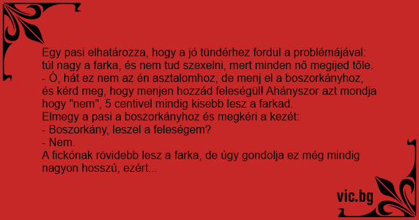 - Ó, hát ez nem az én asztalomhoz, de menj el a boszorkányhoz, és kérd meg, hogy menjen hozzád feleségül! Ahányszor azt mondja hogy "nem", 5 centivel mindig kisebb lesz a farkad.
