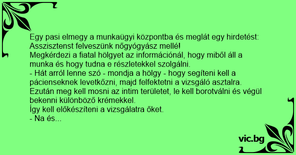 - Hát arról lenne szó - mondja a hölgy - hogy segíteni kell a pácienseknek levetkőzni, majd felfektetni a vizsgáló asztalra.