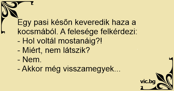 Egy pasi későn keveredik haza a kocsmából. A felesége felkérdezi: