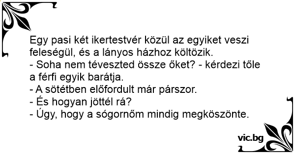 Egy pasi két ikertestvér közül az egyiket veszi feleségül, és a lányos házhoz költözik.