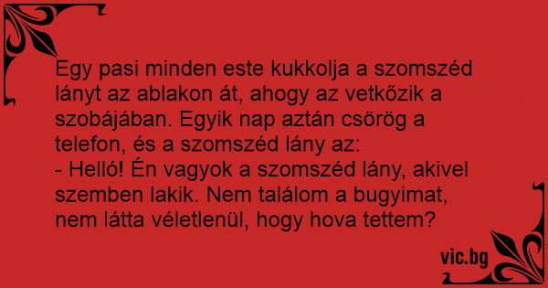 - Helló! Én vagyok a szomszéd lány, akivel szemben lakik. Nem találom a bugyimat, nem látta véletlenül, hogy hova tettem?