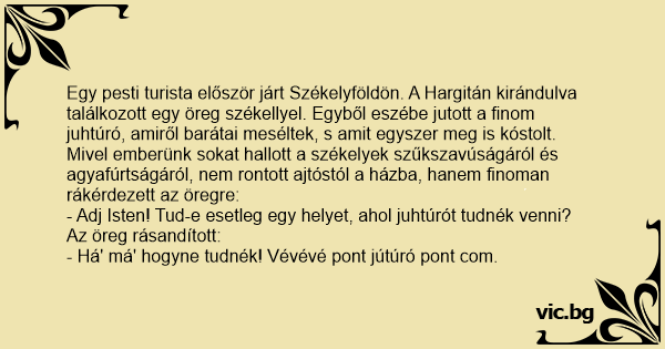 Mivel emberünk sokat hallott a székelyek szűkszavúságáról és agyafúrtságáról, nem rontott ajtóstól a házba, hanem finoman rákérdezett az öregre: