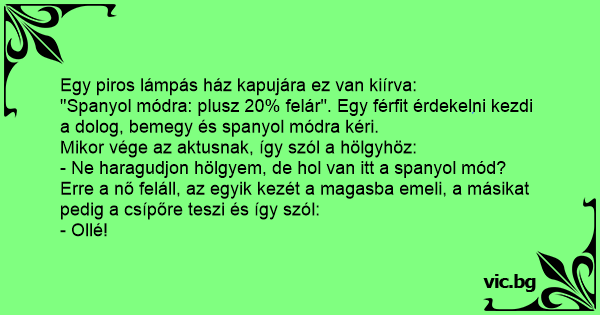 "Spanyol módra: plusz 20% felár". Egy férfit érdekelni kezdi a dolog, bemegy és spanyol módra kéri.